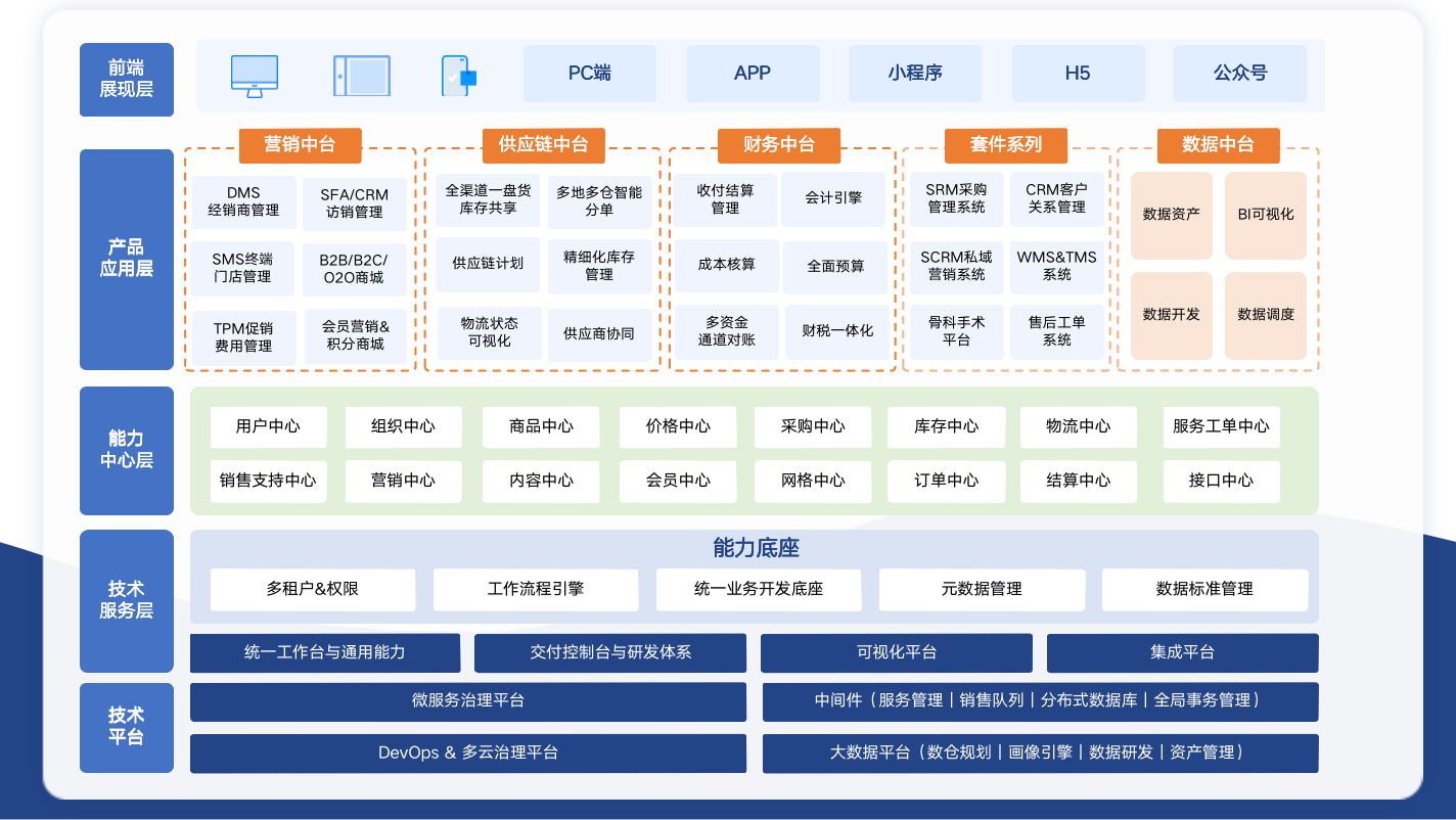 其中,业务应用层将中台各项细分的能力进行整合,从而满足业务运营管理的需要。项目中规划了私域网格运营、B2C社交电商平台运营、B2B工商管理运营、商品采购和供应链运营、售后服务运营、财务结算6大类应用。